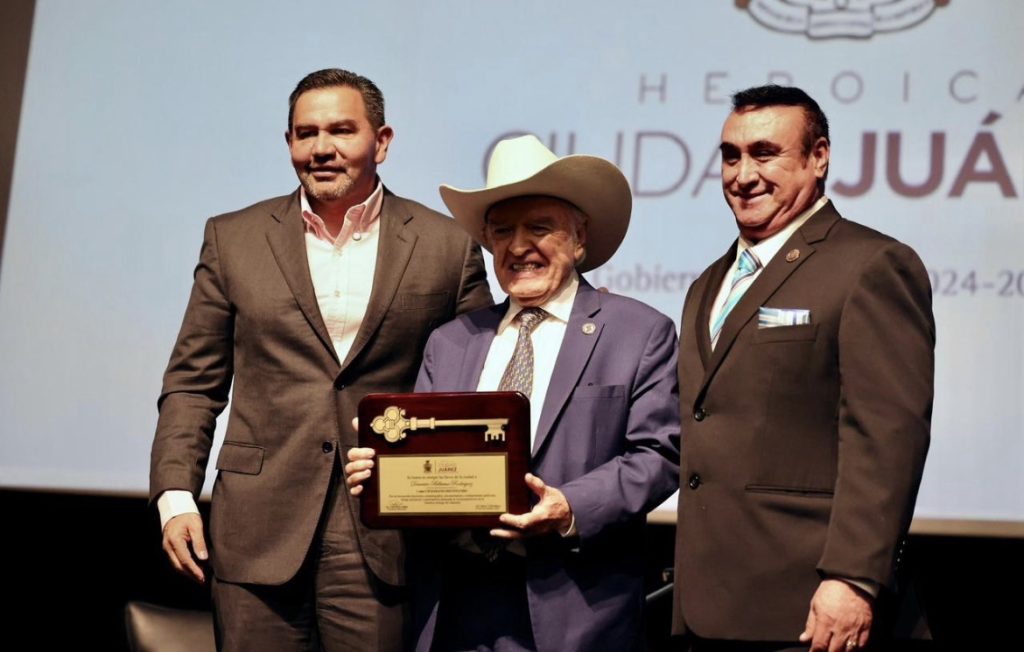 “Que estas llaves no sean solamente un recuerdo, sino el testimonio tangible del afecto y respeto de nuestra comunidad. Don Demetrio, nuestro reconocimiento más sincero y sea siempre bienvenido a Ciudad Juárez”, expresó el alcalde Pérez Cuéllar.