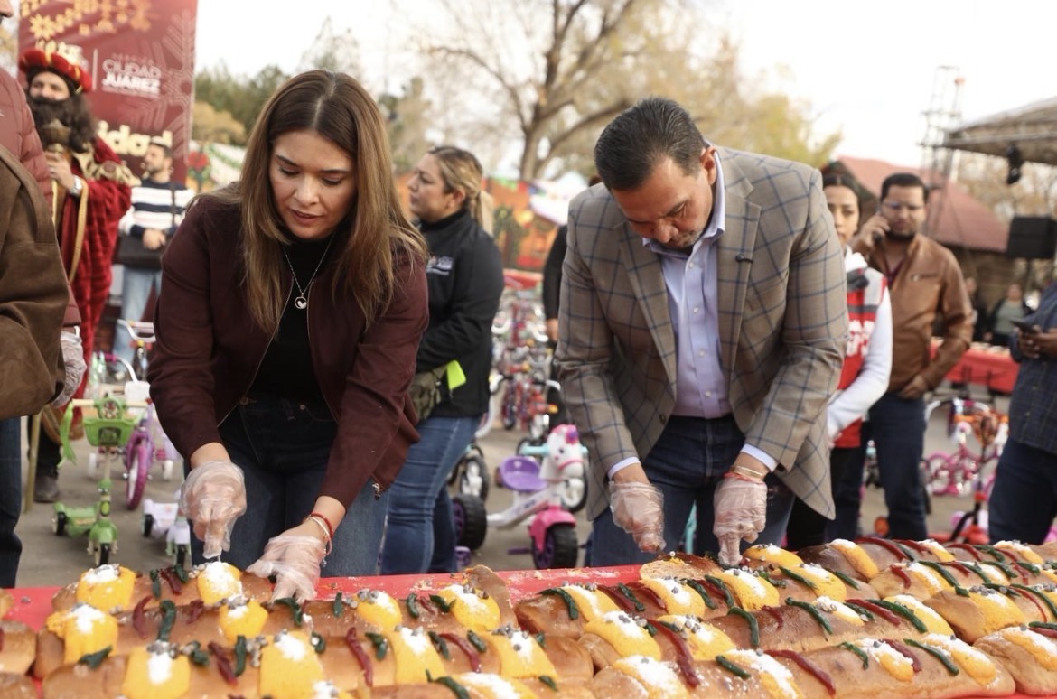 Cientos de familias juarenses acudieron esta tarde al parque DIF, situado en la avenida Heroico Colegio Militar, para partir la rosca gigante de 300 metros por el Día de los Reyes Magos.